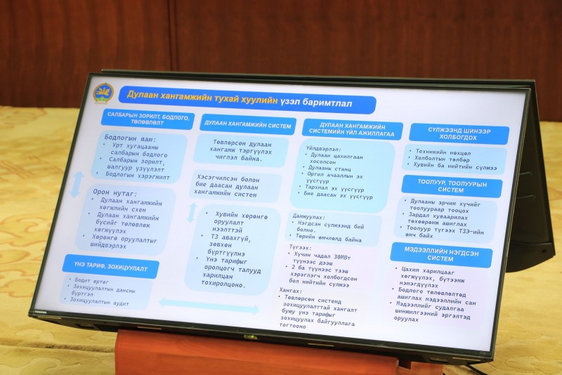 Эрчим хүчний бие даасан байдлыг нэмэгдүүлэх, ногоон эрчим хүчний асуудлаар санал, дүгнэлт гаргах, холбогдох хууль тогтоомжийн төсөл боловсруулах үүрэг бүхий ажлын хэсгийн хоёр дахь хурал болов. Ажлын хэсэгт ахлагчаар УИХ-ын гишүүн М.Энхцэцэг, УИХ-ын гишүүн Ц.Сандаг-Очир, Н.Наранбаатар нарын гишүүд ажиллаж байна. Хуралдаанаар хаврын чуулганаар хэлэлцэхээр төлөвлөж буй Дулаан хангамжийн тухай анхдагч хуулийн төсөл, Тархмал эх үүсвэртэй холбоотой цахилгаан түгээх сүлжээний үүрэг, хариуцлага, тулгамдаж буй асуудлыг хэлэлцэв.